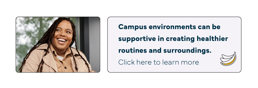 Excess weight among college students has been associated with higher rates of elevated blood pressure, abnormal cholesterol, insulin resistance, and sleep disturbances.6 These outcomes are closely tied to behavioral and environmental factors common in college life, including irregular schedules, limited access to nutritious food, inadequate sleep, and high stress. Studies show that improvements in dietary quality, such as reducing high-calorie and high-salt foods and increasing fiber intake, are associated with measurable improvements in students’ physical health, yet messaging should shift focus away from weight loss and toward supporting healthier routines and surroundings.7 To learn more about the prevalence of obesity among students, and how campus environments can be supportive in fighting its impacts, click here [LINK to obesity article].